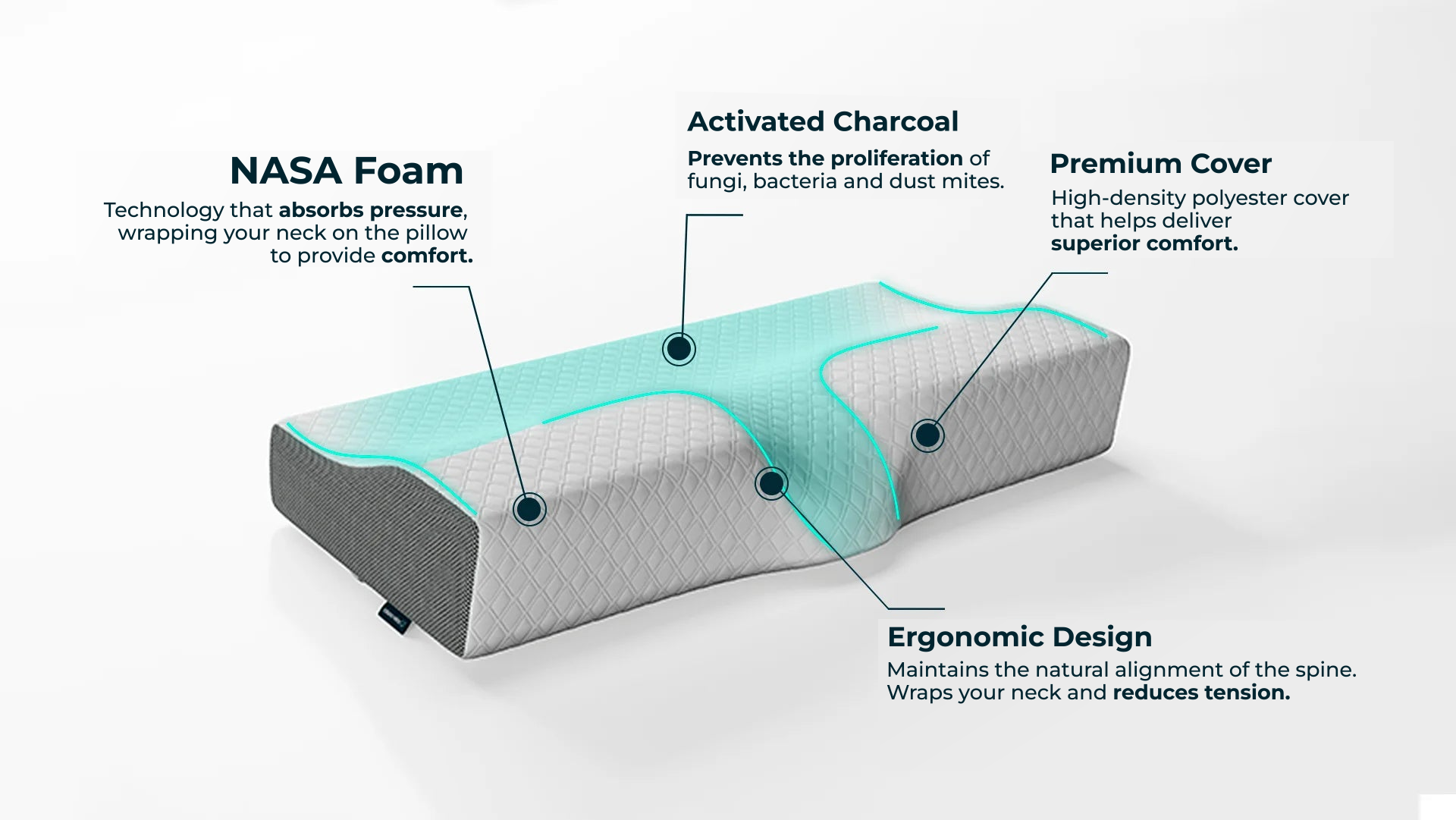 The Cervical Coluna Relax® Pillow is made with NASA foam, a technological foam that adapts to your body shape and absorbs impact when lying down. The pillow cover is 100% cotton.